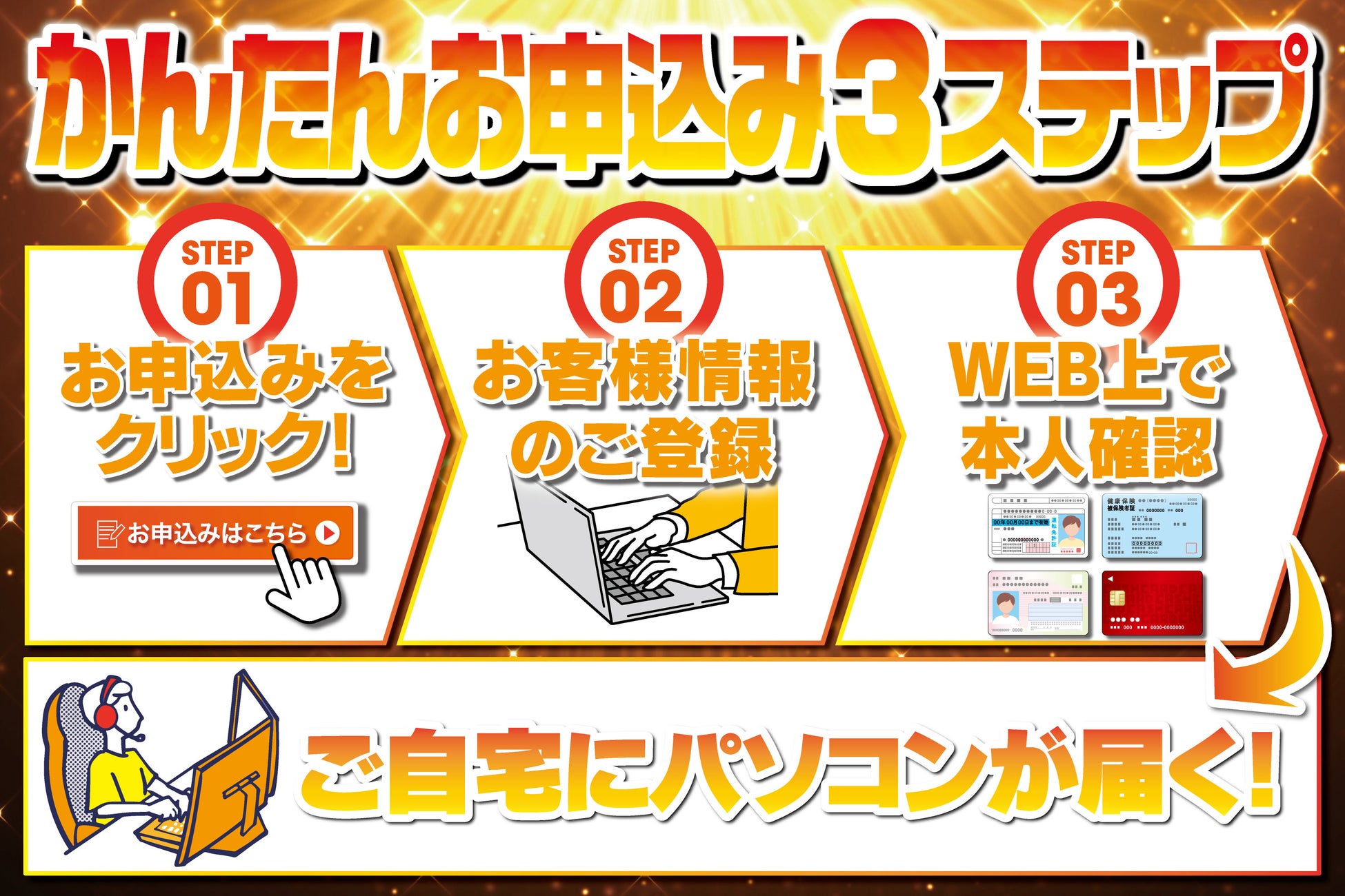 お申込みは24時間いつでもどこでもお手軽3ステップ! 必要なものもクレジットカードと本人確認書類の2点だけ!